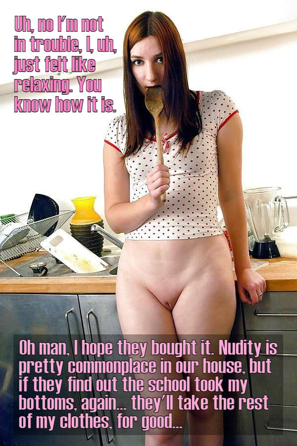 1. You could avoid such a dilemma in the future if you are always completely naked at home or if you ask your parents to do so if their consent is necessary. When that is resolved, you call your school and ask if they would accept full nudity as a kind of voluntary school uniform. Also ask the school if you can wear your new “nudiform” on the way to school and outside of schooltime too as a kind of voluntary homework to encourage other students to try the “nudiform” or to bring this idea to their parents. That way, no one will think of taking any clothes away from you, no matter where you’re doing nonsense. You then also have the freedom to wear clothes again at any time if necessary. Remember… the nudiform is voluntary 😉