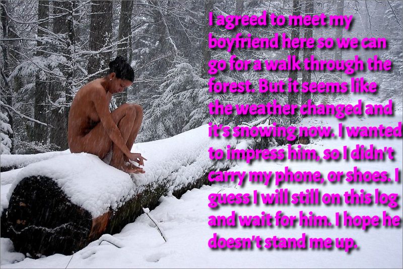 3. If she is not acclimated to the cold while naked, she is endangering her life just to walk with her boyfriend. She needs to go home and put on appropriate clothing unless she is PN. Then she needs to wrap herself in a blanket in front of a warm fireplace. Sitting on that log in the snow is just stupid. The walk with her boyfriend can wait.
