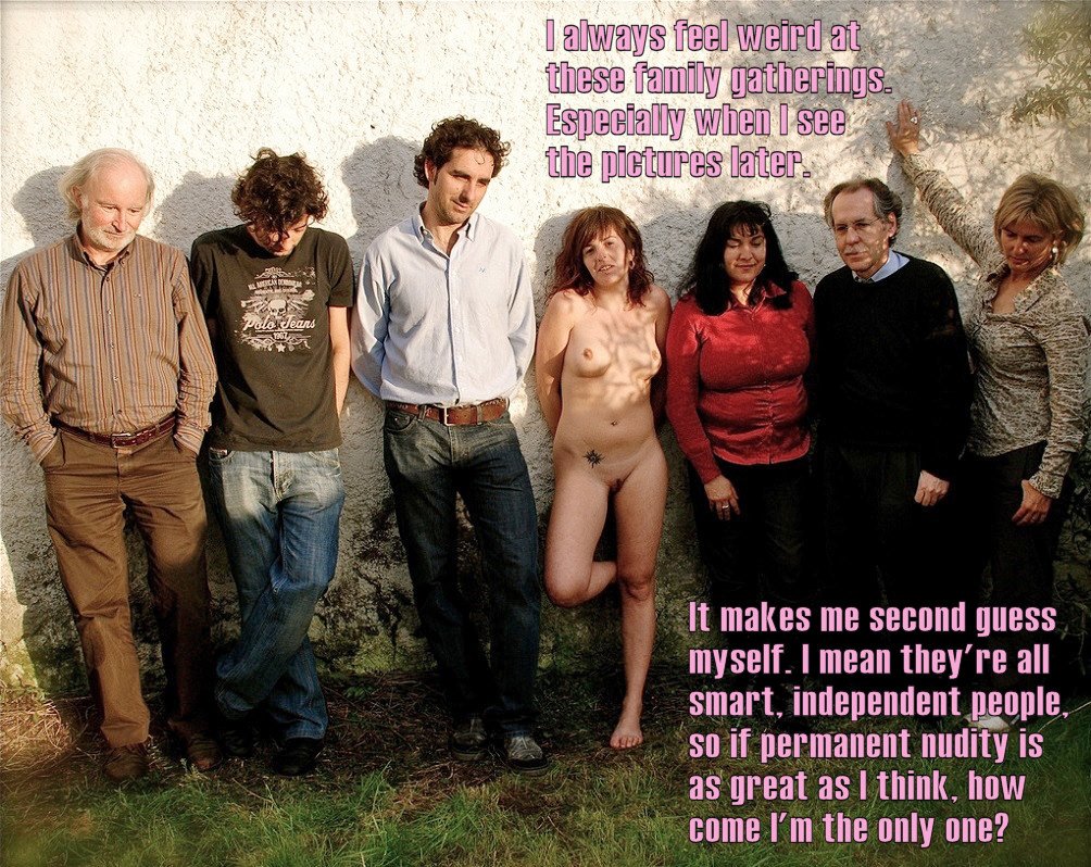 Meanwhile and although she feels second thoughts, afterwards, our naked girl is very dedicated to her status of strict pemanude : she doesn’t avoid family gatherings, even if she is only tolerated there, and she even tries (if you notice well) to practice some kind of nudiquette ! Although its obviously impossible to put legs wide apart while standing, she makes the effort to hold herself on one leg only, raising the other one and rotating it somehow, to make her sexual parts more visible (with no great success, in fact).