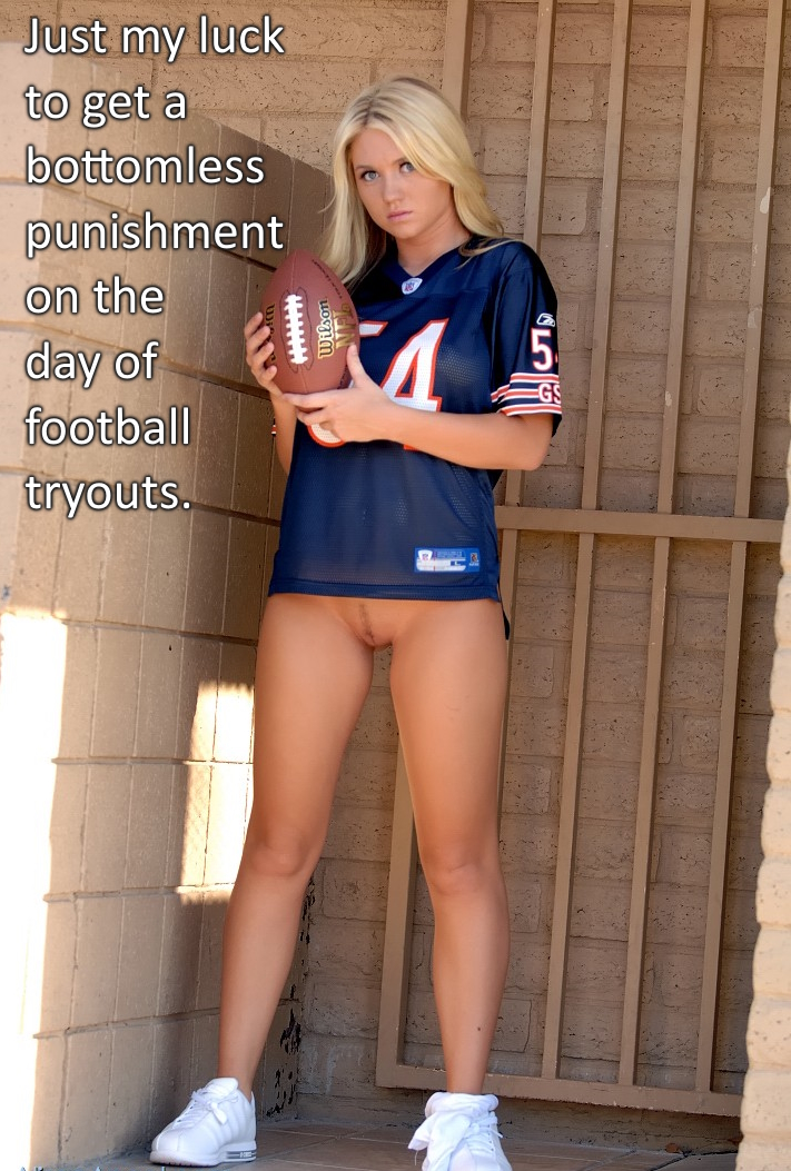 1. Mindy reluctantly went to her first practice after her bottomless punishment. As the team’s center, she wasn’t sure how she or the quarterback were going to handle hiking the ball.
