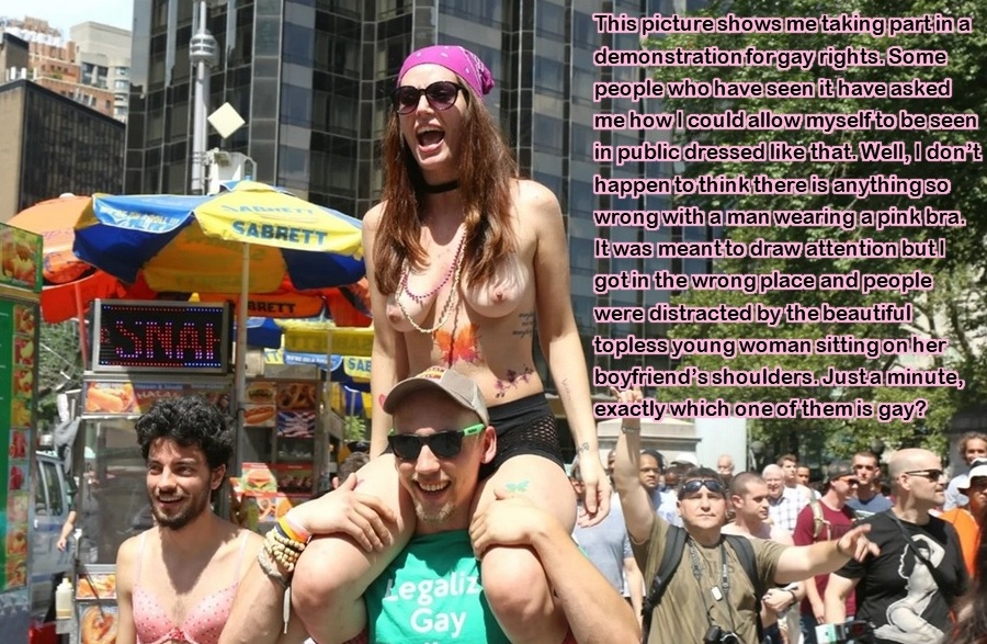 2. The female riding the back of a man has lost her top in all of the activities during that particular demonstration. She is not competing for attention with the man wearing a pink bra. It wasn’t her bra anyway. By the way, that is her father whose shoulders she is sitting on. He did not know that she was topless and lost her bra. He works out regularly so he is strong enough to carry his topless daughter all of the way home.
