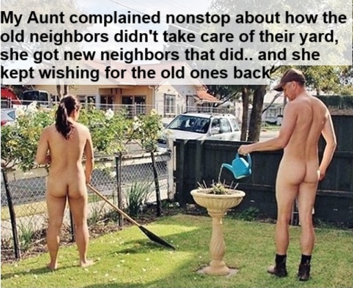 1. My aunt complained bitterly about the nude couple until the husband mowed her lawn every week after her husband died. After that she complained about the neighbors on the other side who held loud parties.