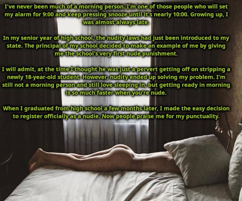 Chronic Lateness Cured Posted on November 1, 2025November 1, 2025 by NudeWorldOrder Submitted by pnfan. Loading Likes...